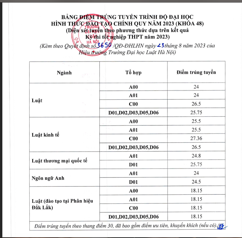 Trường học Luật Hà Nội công bố điểm chuẩn năm 2023, cao nhất 27.36 điểm