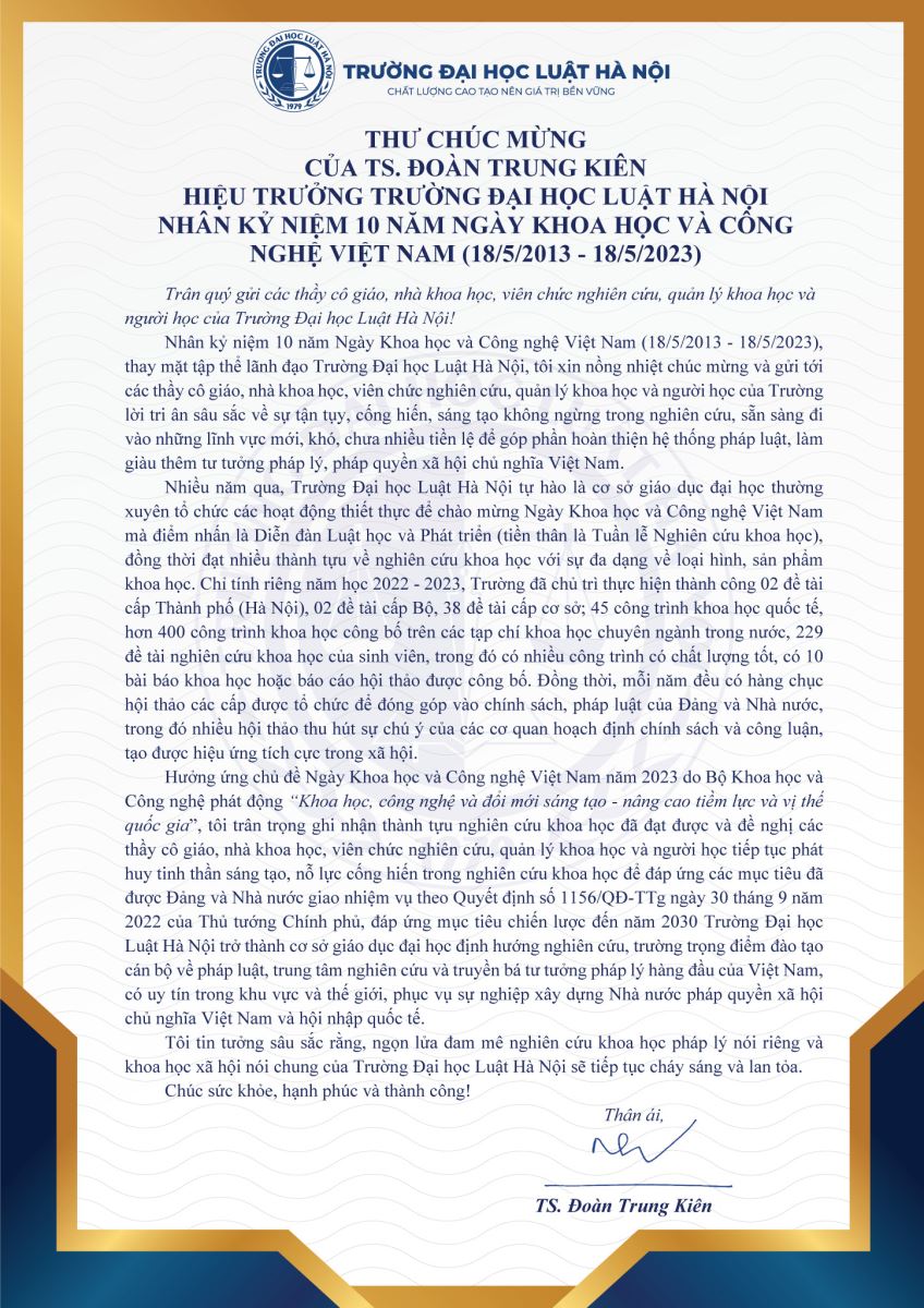 Thư chúc mừng của TS. Đoàn Trung Kiên - Hiệu trưởng Trường Đại học Luật Hà Nội nhân Ngày Khoa học và Công nghệ Việt Nam 18/5