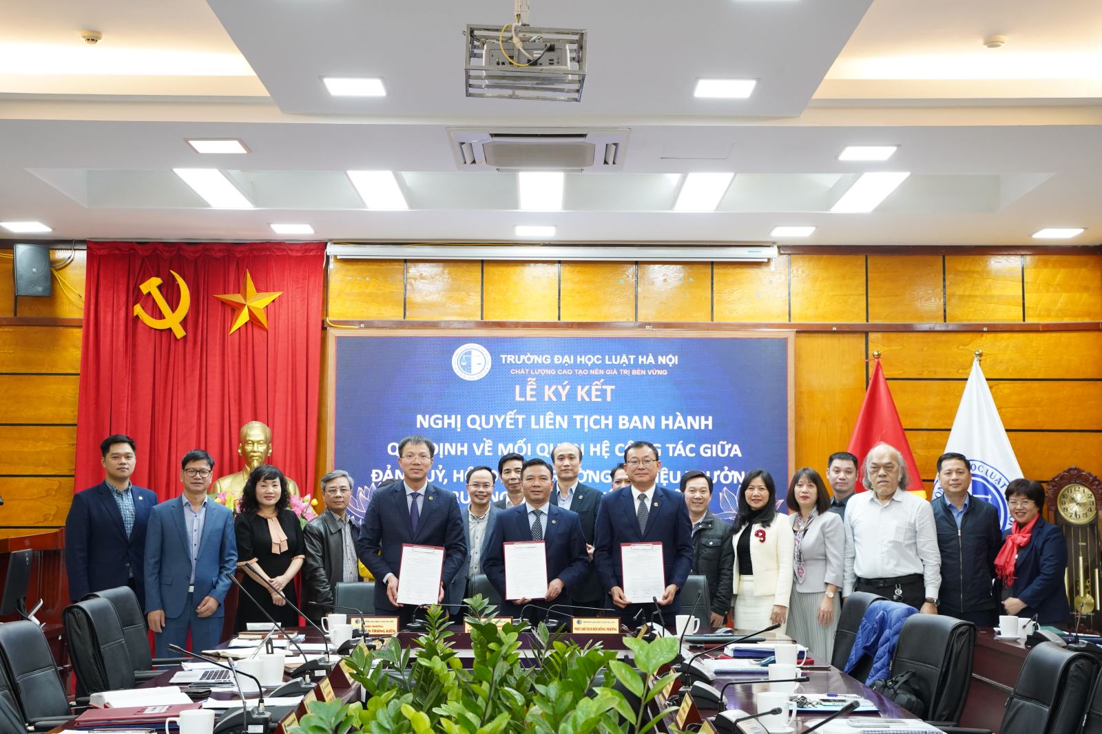 Lễ ký kết quy định về mối quan hệ công tác giữa Đảng ủy, Hội đồng Trường và Hiệu trưởng Trường Đại học Luật Hà Nội.