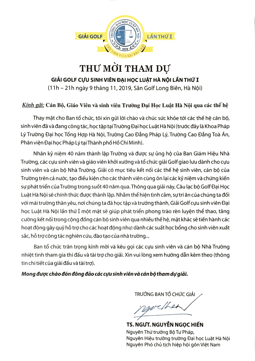 Thư mời tham dự Giải Golf cựu sinh viên Đại học Luật Hà Nội lần thứ I
