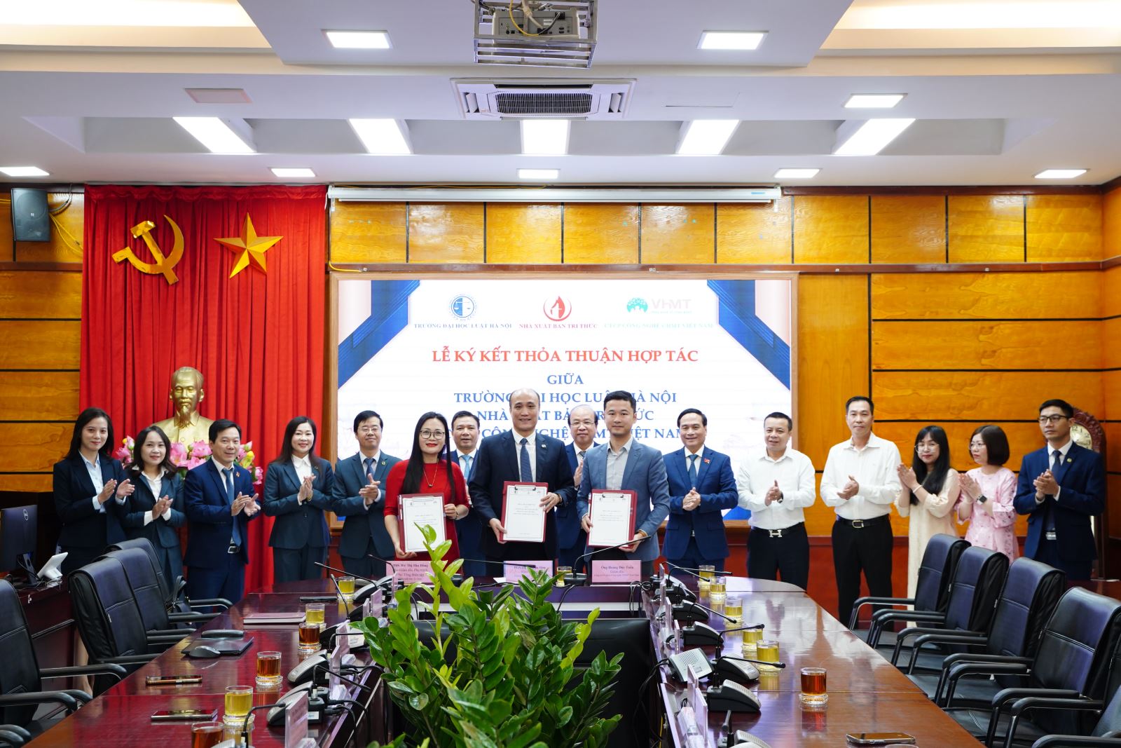 Lễ ký kết thỏa thuận hợp tác giữa Trường Đại học Luật Hà Nội, Nhà xuất bản Tri thức và Công ty Cổ phần Công nghệ VHMT Việt Nam.