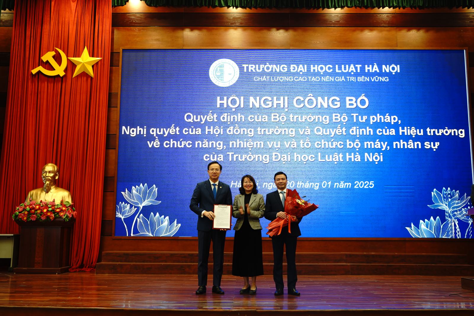 Hội nghị công bố Quyết định của Bộ trưởng Bộ Tư pháp, Nghị quyết của Hội đồng trường và Quyết định của Hiệu trưởng về chức năng, nhiệm vụ và tổ chức bộ máy, nhân sự của Trường Đại học Luật Hà Nội