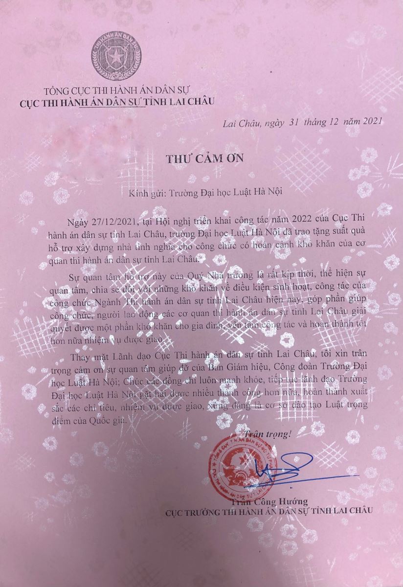 Thư cảm ơn của Cục Thi hành án dân sự tỉnh Lai Châu gửi tới Trường Đại học Luật Hà Nội